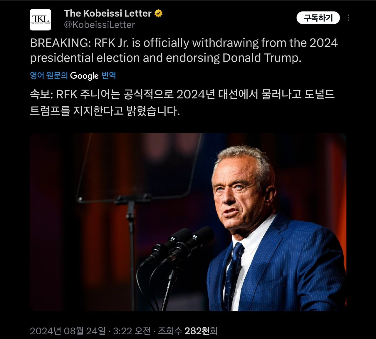 - 미국의 무소속 대선 후보 로버트 F. 케네디 주니어가 23일(현지시각) 그동안 떠들썩했던 자신의 선거운동 중단과 공화당 대선 후보 도널드 트럼프 전 대통령 지지를 공식 선언했다.