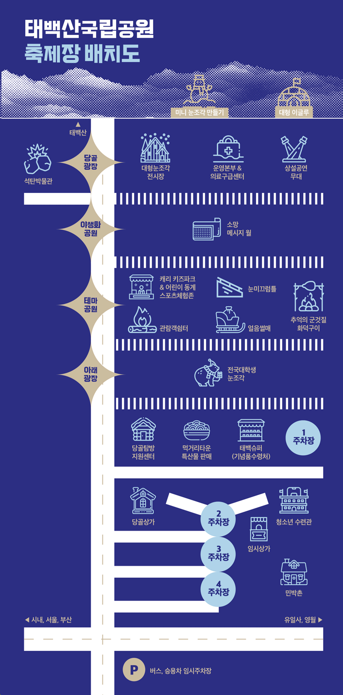 - 주 행사장인 태백산국립공원 당골광장에는 대형 눈 조각 전시, 이글루 카페, 스노 볼 포토존 등이 마련됐다.