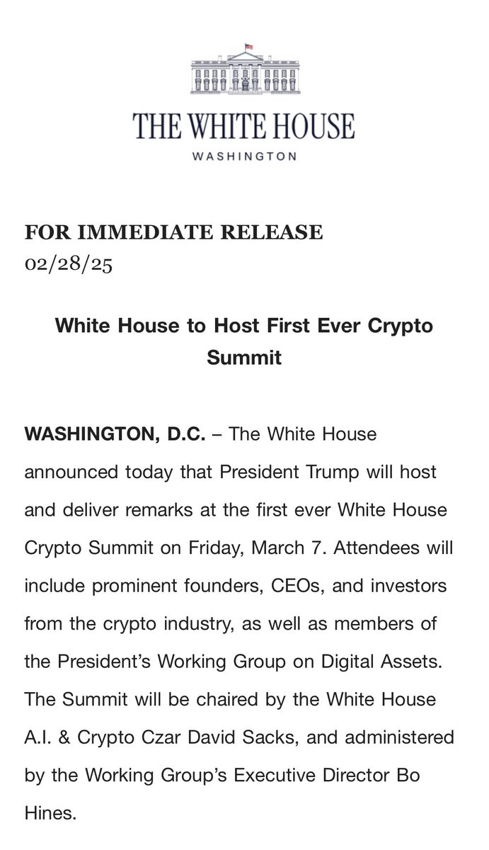 - "정상회담은 백악관 AI 및 암호화폐 차르인 데이비드 삭스가 의장을 맡고, 실무 그룹의 전무 이사인 보 하인스가 진행합니다."