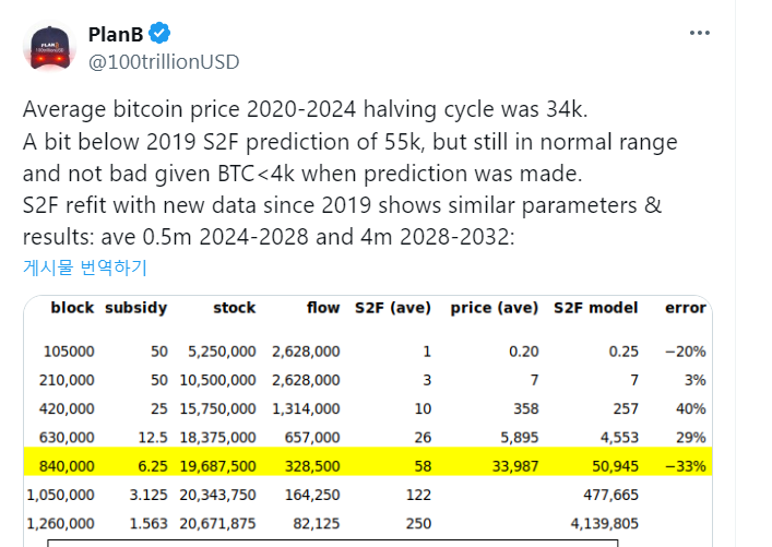 - 플랜B는 엑스(구 트위터)에 공유한 자료에서 이번 반감기(2024-2028) 동안 비트코인의 평균 가격이 47만 7665 달러에 이를 것이라고 밝혔다.