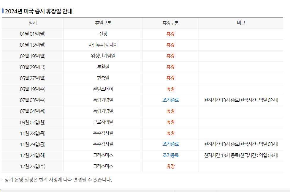 2024년 미국 주식 증시 휴장일