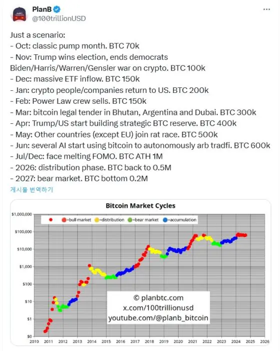- 플랜B는 이를 통해 비트코인이 12월까지 10만 달러, 연말까지는 15만 달러에 이를 것이라고 내다봤다.