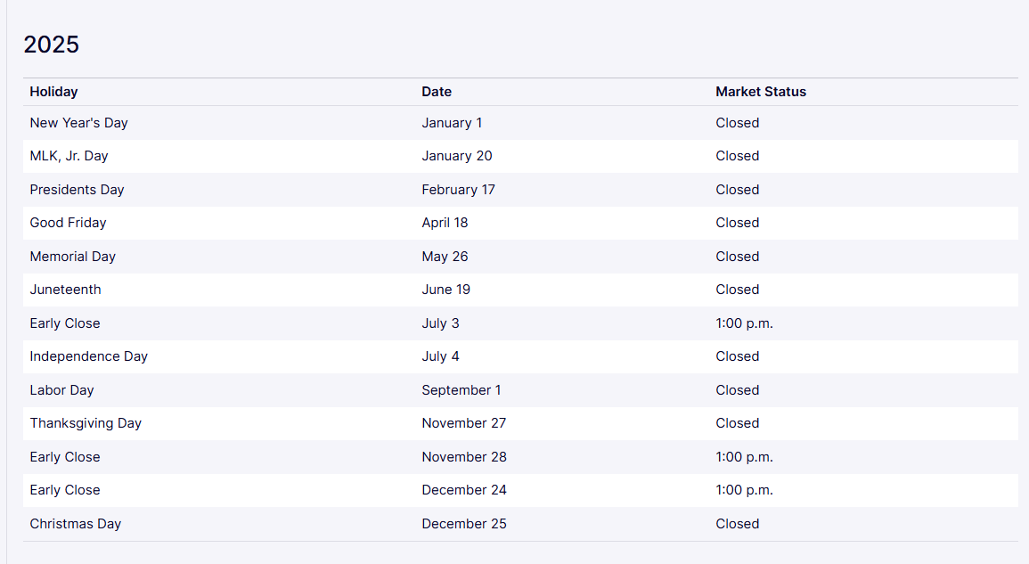 * Each market will close early at 1:00 p.m. (1:15 p.m. for eligible options) on Thursday, July 3, 2025. Crossing Session orders will be accepted beginning at 1:00 p.m. for continuous executions until 1:30 p.m. on that date, and NYSE American Equities, NYSE