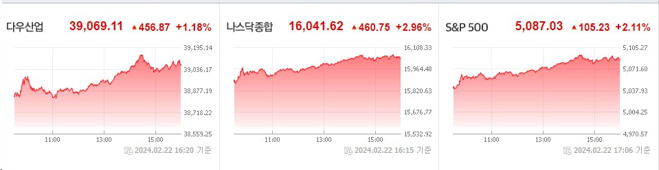 2024년 2월 23일 오늘의 뉴스로 배우는 세상 ★ 2024.02.23 U.S. Market DOW ▲ 38,611.85 (+0.1%) S&P500 ▲ 4,981.84 (+0.1%) NASDAQ ▲ 15,580.87 (+0.3%) RUSS 2K ▲ 1991.79 (+0.6%) PHLX 반도체 ▲ 4,446.37 (+0.2%) 그저 갓 킹비디아