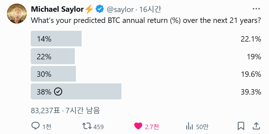- 30일(현지시간) 암호화폐 전문매체 유투데이에 따르면, 세일러는 자신의 X(구 트위터) 계정에서 "앞으로 21년 동안 비트코인의 연간 수익률은 몇 퍼센트일까?"라는 질문을 던지며, 14%, 22%, 30%, 38% 중 하나를 선택하도록 했다.